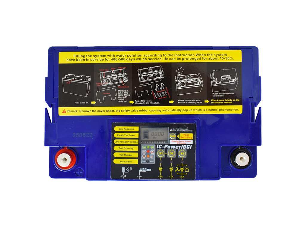Each GOOWEI ENERGY battery from the OTD-DEEP CYCLE series contains ampoules with diluted electrolyte with a density of 1.05 - 1.10g/ml, which are stored in the battery lid and serve to extend the battery life. During demanding operation (frequent and deep discharge), even maintenance-free batteries gradually lose electrolyte (distilled water partially evaporates and sulfur gradually settles in the grid plates of the cells = sulfation). The manufacturer increases the useful value of the battery in this innovative way. It is recommended to add this diluted electrolyte to all battery cells after approximately 100 cycles or 18 months of operation, which will actually extend its service life by approximately 15 to 30%. Adding diluted electrolyte is not a necessity, it is just an added value that serves to extend the service life of the battery. This one-time step does not affect the maintenance-free nature of the battery. When adding diluted electrolyte, it is necessary to follow the safety instructions, see the instructions for use.