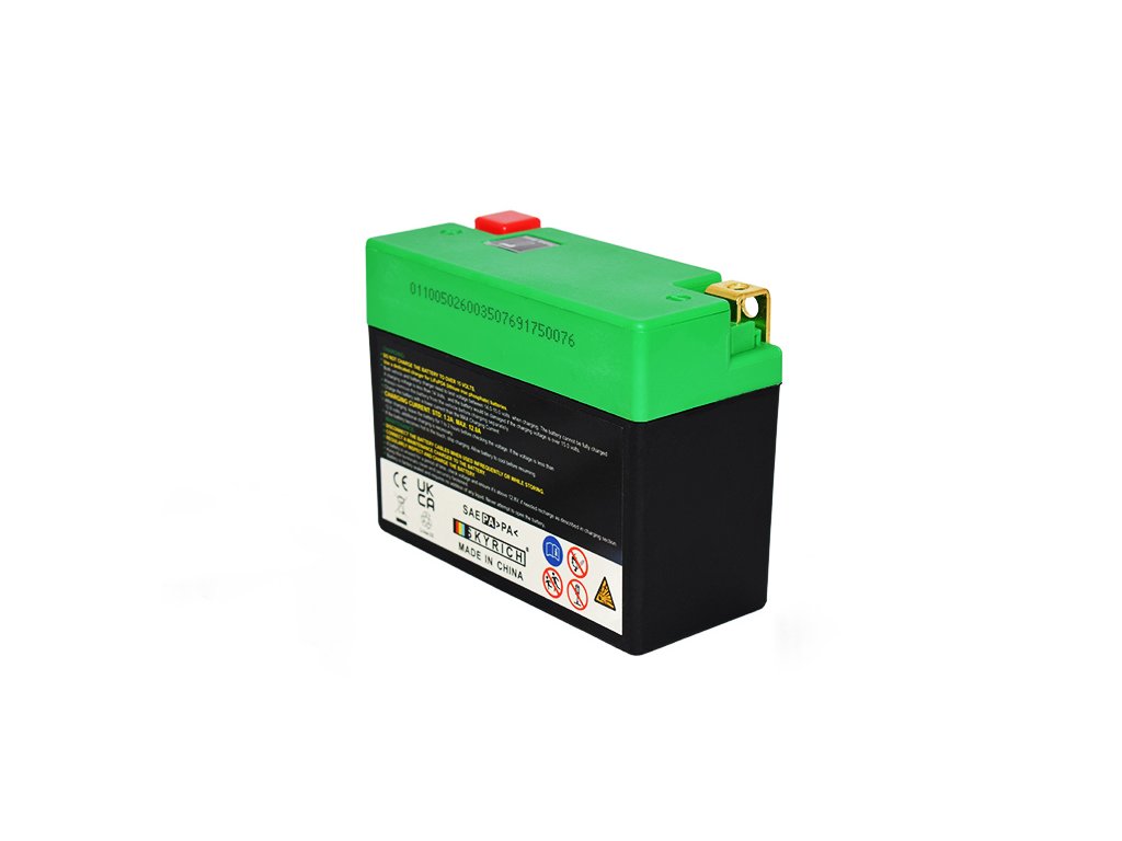 All motorcycle starter lithium (LiFePO4) accumulators by Skyrich have a discharge current up to 40 times greater than their capacity. Due to the use of lithium technology, Skyrich Lithium motorcycle batteries are up to 66% lighter than traditional lead-acid batteries and have a lifespan of up to 2000 charge cycles. Every Skyrich motorcycle battery has a low self-discharge. The shelf life is up to 1 year at a temperature of up to 25°C. The manufacturer recommends regular charging at least once every 6 months.