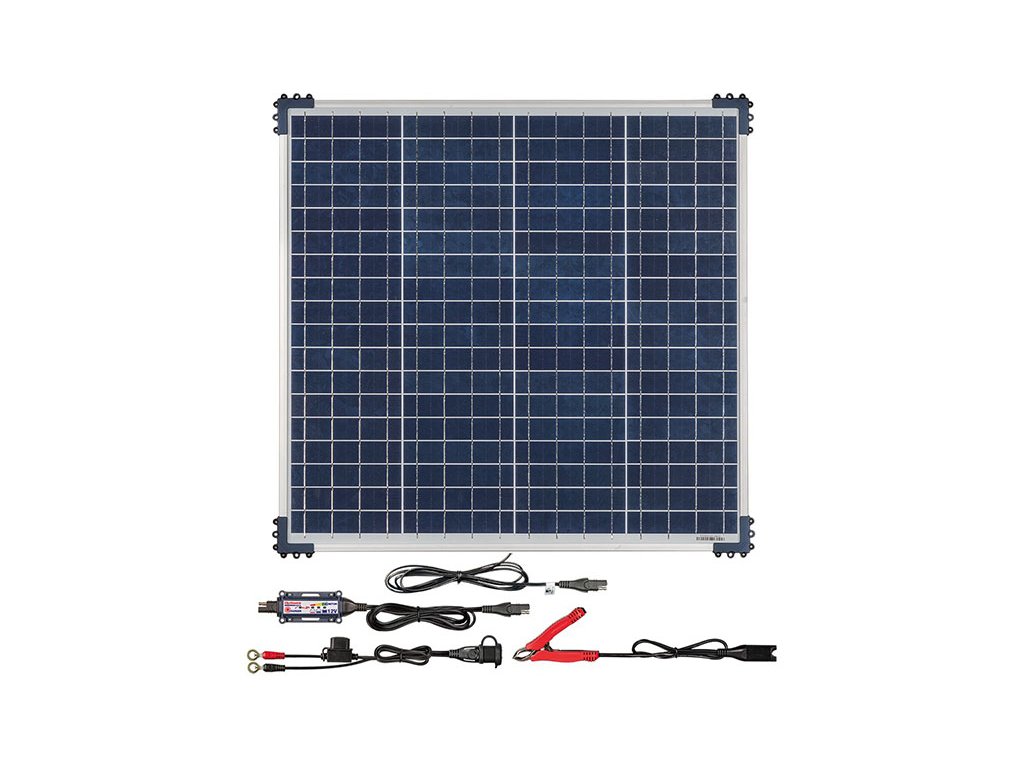 The OptiMATE charger and monitoring controller is separate from the solar panel and can be placed near the vehicle or battery to easily monitor the charging and maintenance progress. The solar panel must be mounted and tilted to receive direct sunlight.